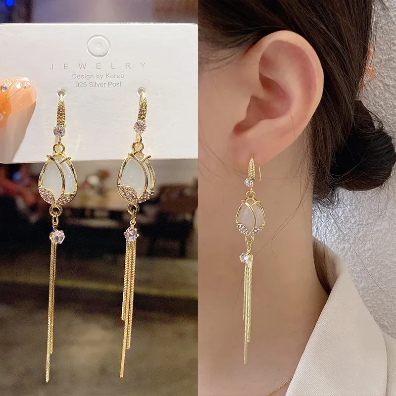 Teardrop crystal motif with hanging chains — graceful evening charm. 💎