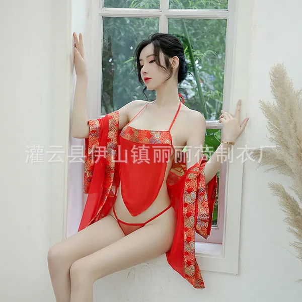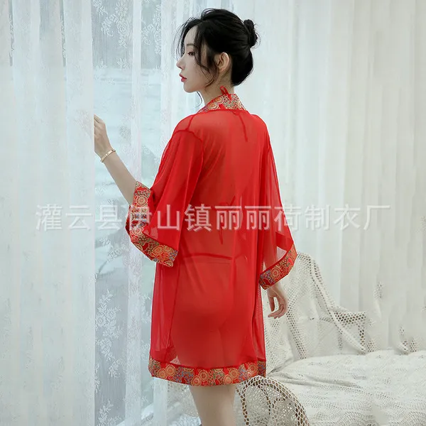 The UJAIBA CrimsonAura Kimono Lingerie Set combines delicate allure with bold style. This 3-piece set includes a sheer 3/4 sleeve kimono robe, a sleeveless nightgown, and a matching G-string. Crafted from lightweight chiffon, the robe features a tie-front closure for easy layering. The solid red tone enhances femininity, while the breathable fabric provides both comfort and visual appeal. Ideal for romantic nights, gift sets, or luxurious loungewear, CrimsonAura delivers timeless seduction in every thread.