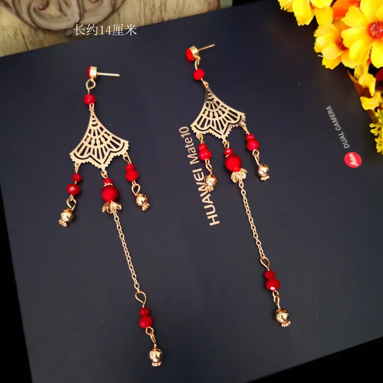 Long red-beaded earrings with ornate fan-shaped gold tops; festive & dramatic. ❤️