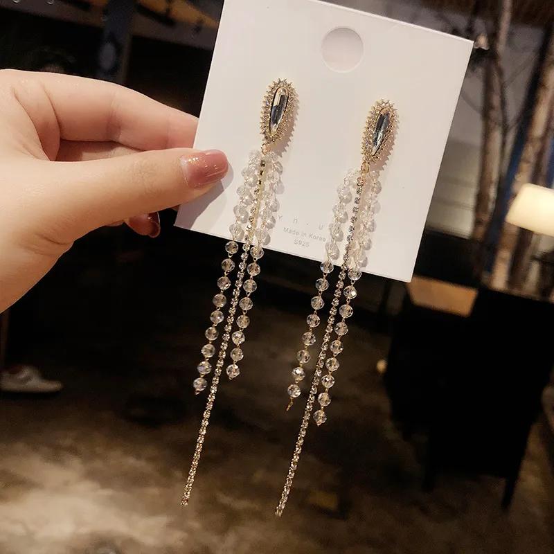 Elegant crystal chains flowing from teardrop tops for evening glam. đ