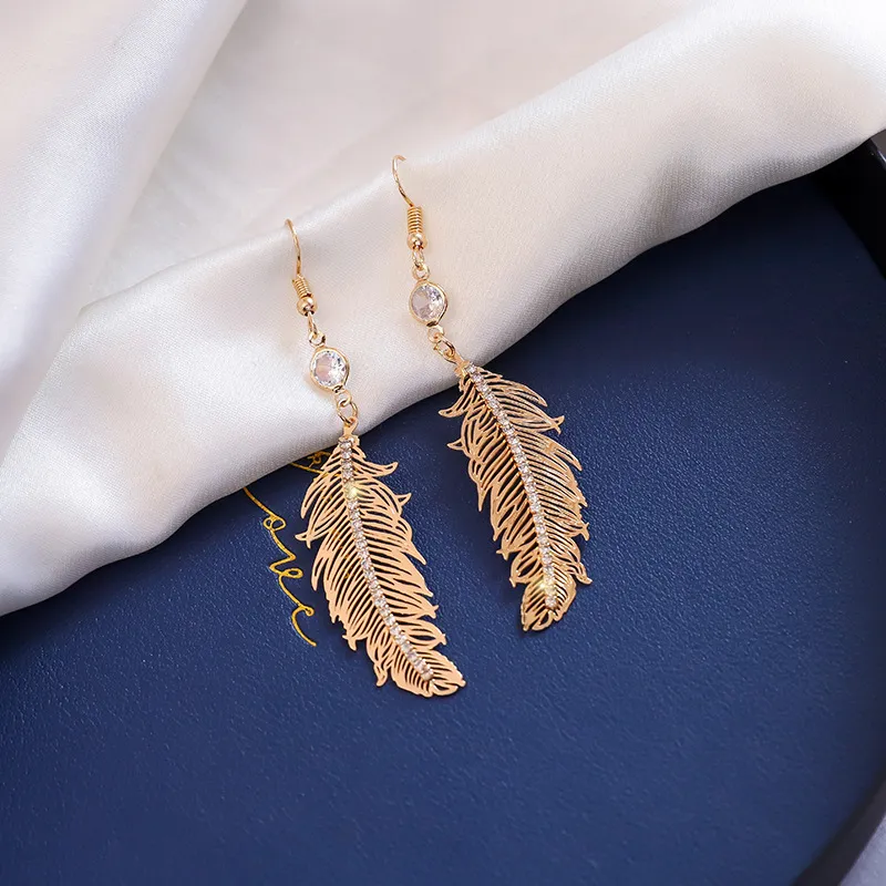 Lightweight feather-inspired gold earrings with crystal tops. đĒļ