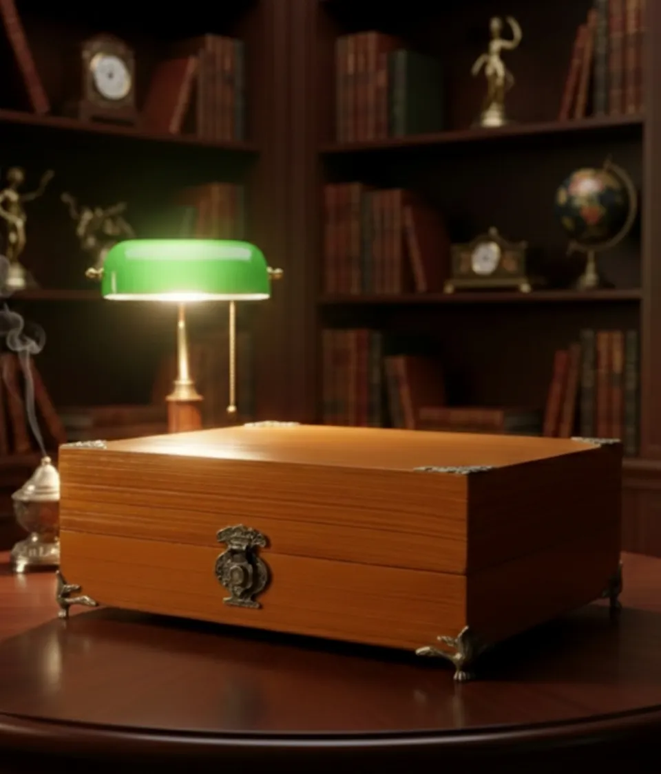 এন্টিক হার্ডওয়্যার: বক্সের চার কোণায় এবং মাঝখানে রয়েছে এন্টিক ব্রোঞ্জ মেটাল লকিং সিস্টেম ও কর্নার গার্ডস।