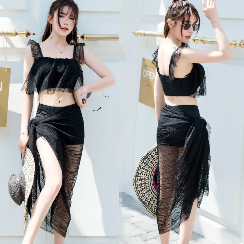 LaceWave 3-Piece Split Bikini with Veil Skirt