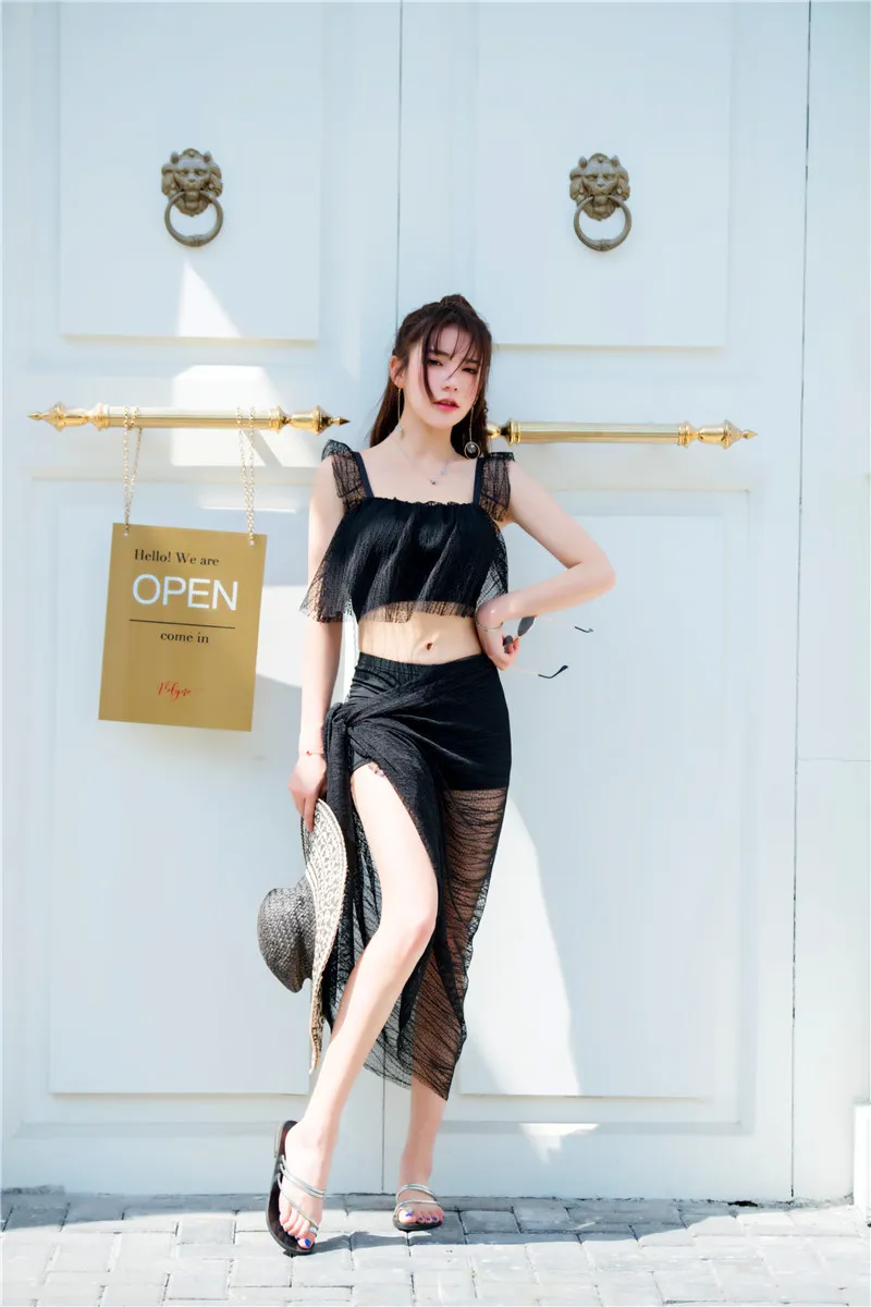Flow with grace in the UJAIBA LaceWave – a 3-piece bikini set featuring a steel ring top, high-leg bottom, and see-through lace veil skirt for elegant beach styling.
