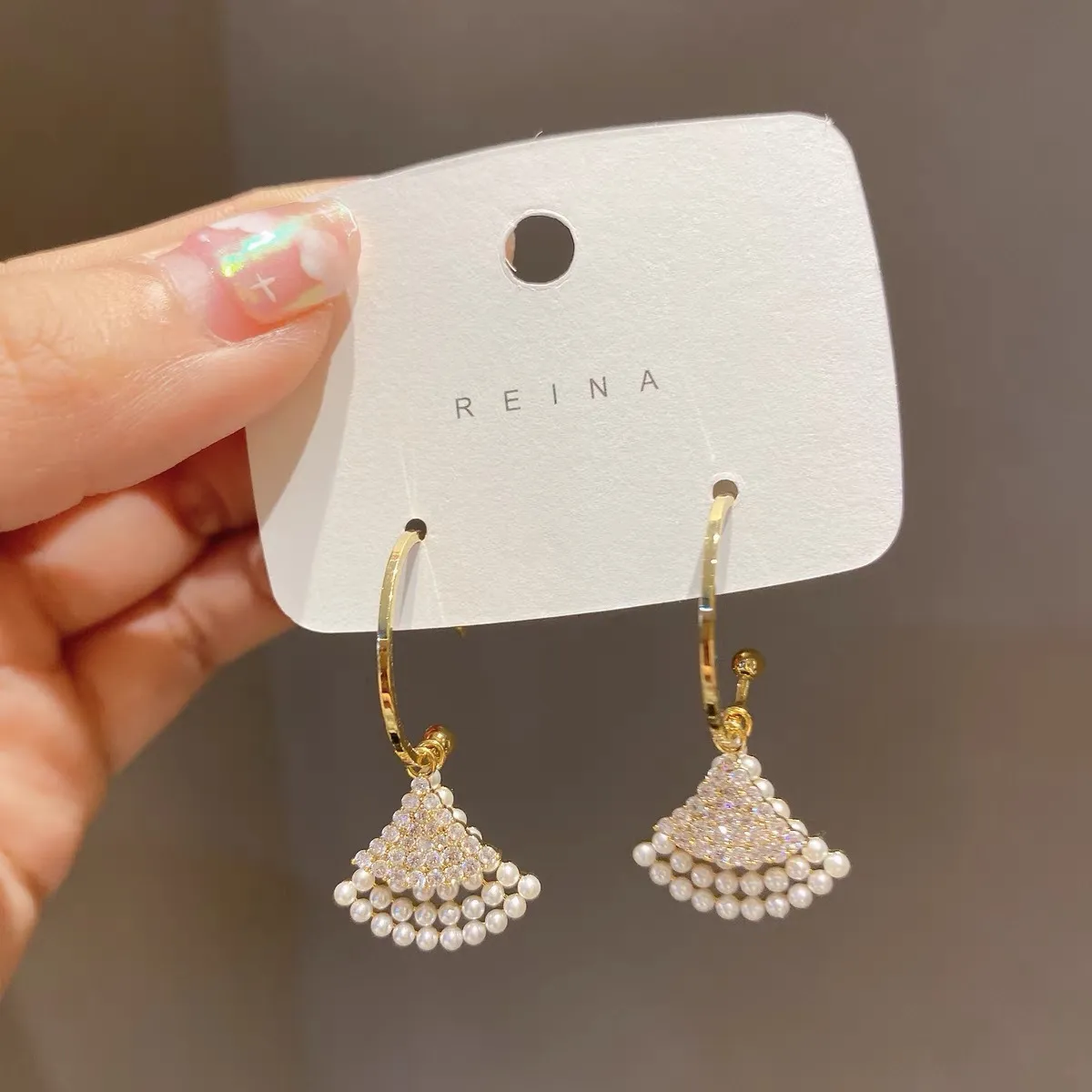 Small fan-shaped pearl-encrusted hoops; subtle luxury for everyday shine. đŧ
