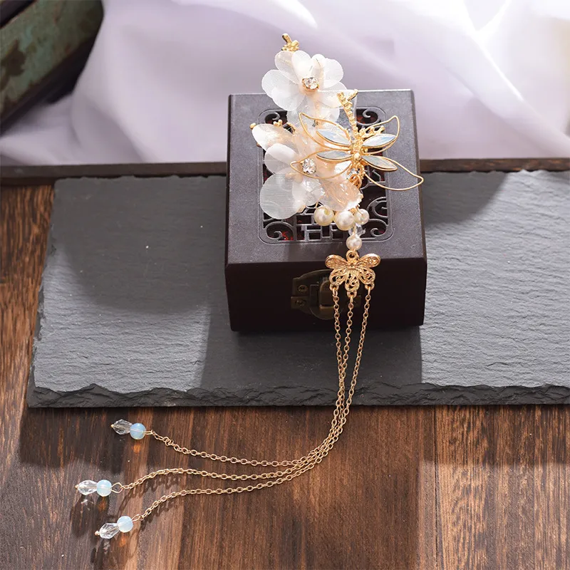 Elegant gold floral hairpin featuring soft white petals, pearl accents, and delicate butterfly chains. Perfect for weddings, festivals, or royal-inspired looks.