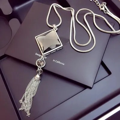 Elegant long pendant with a large faceted crystal stone, double gem detailing, and soft chain tassel — perfect for evening glam or formal wear.