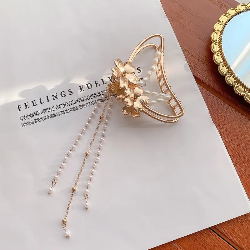 Golden floral clip adorned with soft blossoms and pearl tassel chains â romantic and timeless.