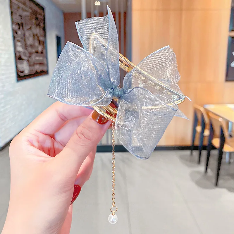 Elegant organza bow hair clip in soft blue tone with pearl drop chain — adds dreamy flair to any outfit.